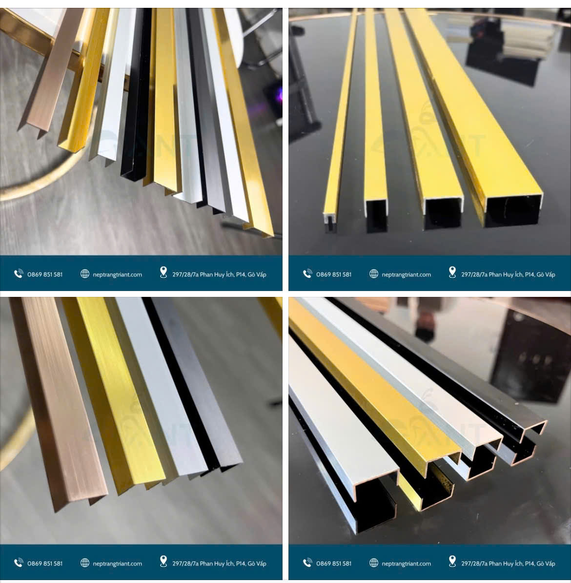 | NẸP NHÔM U15 | 15 x 10 x 2700 | 120.000 | Màu vàng bóng, vàng mờ, màu nhôm, màu inox, màu vàng hồng, màu sâm banh, màu đen |